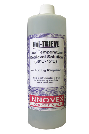 UNI-TRIEVE is a Mild -temperature Universal Retrieval Solution that retrieves for all antibodies, all human and all animal tissues and also cell preps (cytospins. smears) at only 60-75 degrees celsius in 30 minutes using a simple water bath UNI-TRIEVE is totally Background -Free and unlike citrate buffer, high pH buffers, pressure cookers or microwaves, no background or tissue damage/ loss is observed with Uni-Trieve.